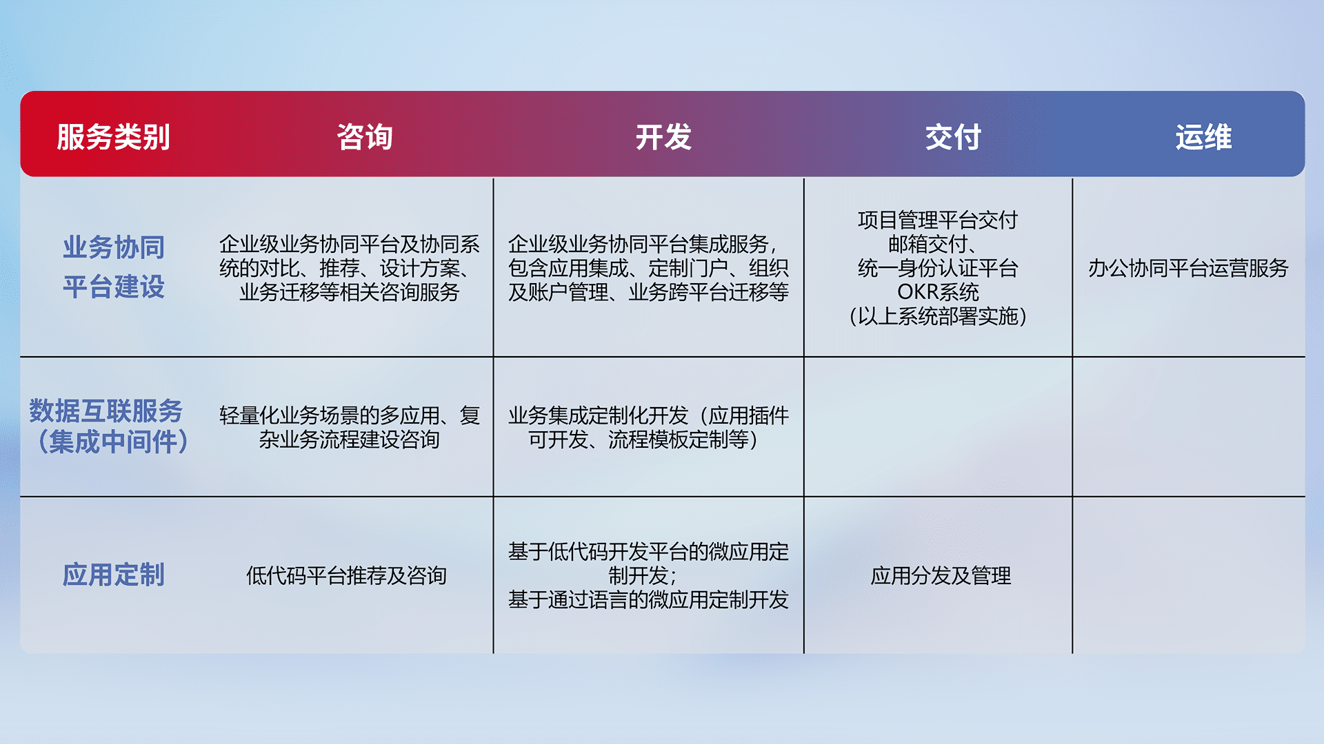 针对钉钉、、、、企微、、IDaas等平台级产品提供产品的规划、、、方案、、、交付、、、、定制化开发等服务,,,,实现如统一协同办公、、智能客户服务、、、混合会议管理、、、智能数据查询、、、等业务场景,,,,实现数字化转型。。。
