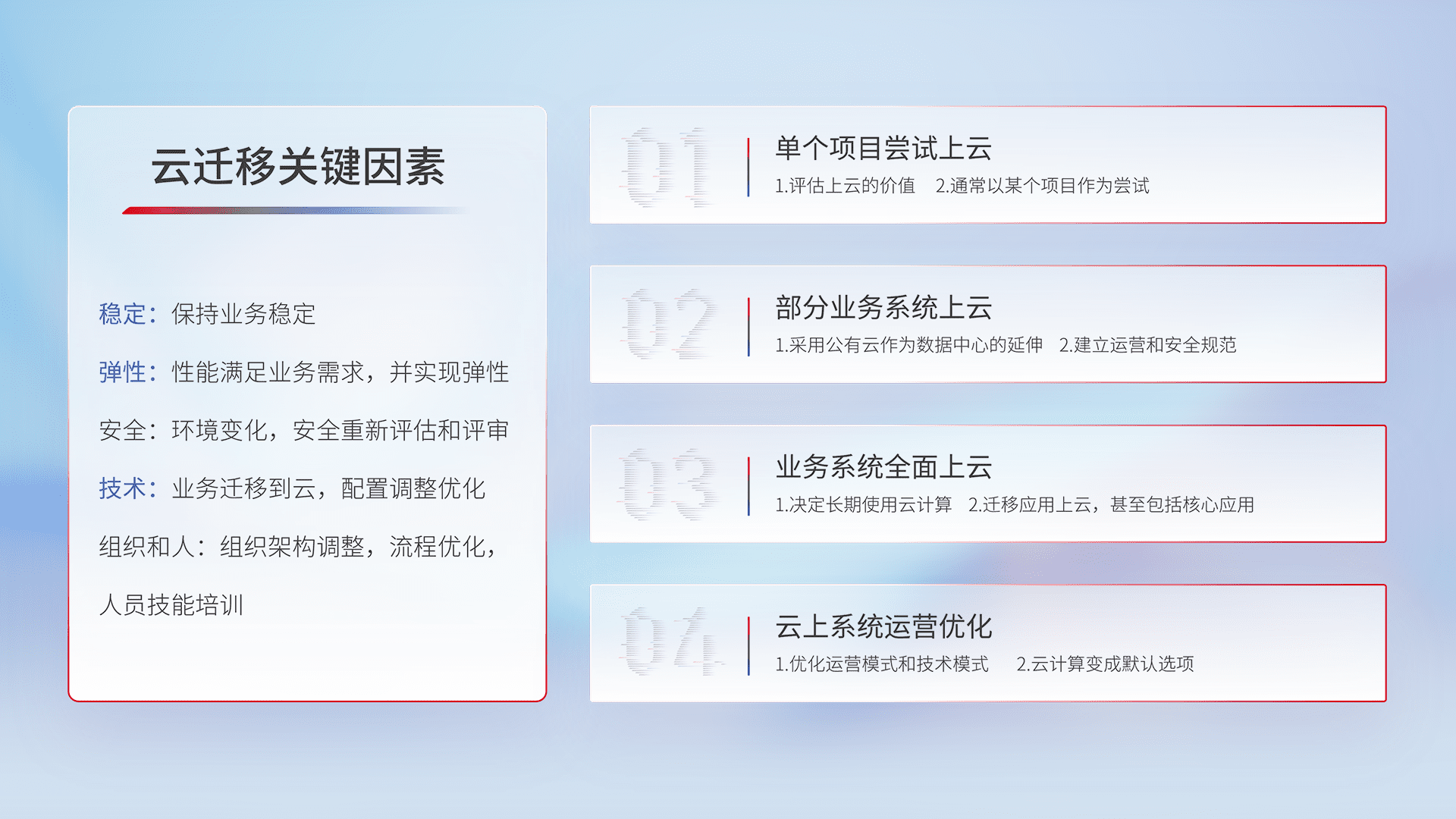 结合实际业务,,,从规划设计、、云平台选型、、云原生改造、、、、数据迁移、、、集成交付,,,迁移全过程为客户识别最佳上云路径,,,做好风险识别管理,,设计网络架构、、、身份权限、、、安全审计合规、、、、操作审计、、日志审计、、监控告警策略、、、多站点容灾设计等,,,对云上基础设施进行整体规划,,,提升IT治理水平,,,,以满足弹性、、、、高可用、、、高性能的需求。。