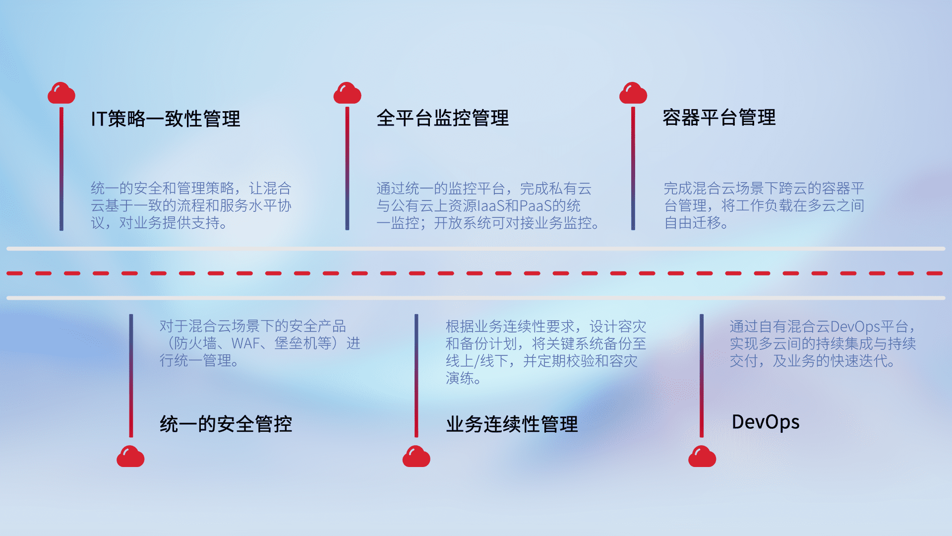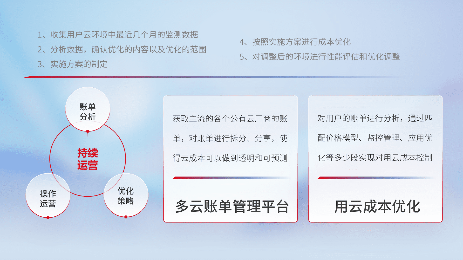 通过多云纳管,,,以统一的资源数据模型把客户的云资源进行抽象和封装,,进而实现对多云资源的统一操作,,,,保障云资源管理的可靠性、、、、稳定性与可用性。。。。量身定制化运维内容,,配置、、开发运维、、补丁管理、、、备份、、监控、、、、认证和访问管理、、、、审计和日常巡检等,,保障在用云过程中的可靠度,,,稳定度以及高可用率。。。